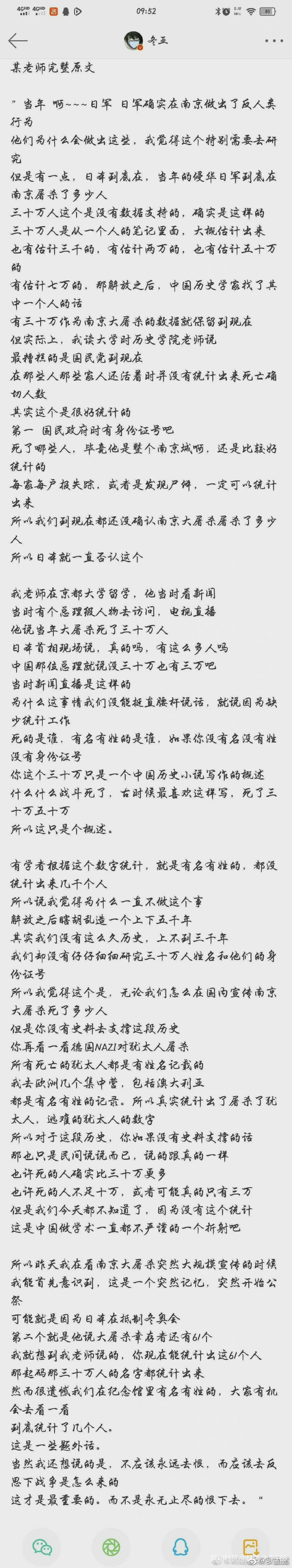 在另一方面,宋老師在公領域的“言論自由”就只是“有限度”的,因為必然要受到道德的約束、紀律的規範和法律的制約,我想這一點大多數中國人都會理解。那麼,就事論事,宋老師在評價和討論“日寇南京大屠殺”這一事件上,是否可以享有完全而充分的“言論自由”呢?當然不行,因為“南京大屠殺”的受害者是我們中華民族的先輩,是我們全體中國人的同胞,而不僅僅是她老宋家的某一個“長輩”,而且,當時的死難者又人數眾多,成為中華民族近百年來最深重的一道傷疤,塑造了我們整個民族的記憶,她當然就必須尊重我們全體中國人的看法和感情,而不是任由自己信口開河,輕易地否定已經被大眾接受的歷史結論。