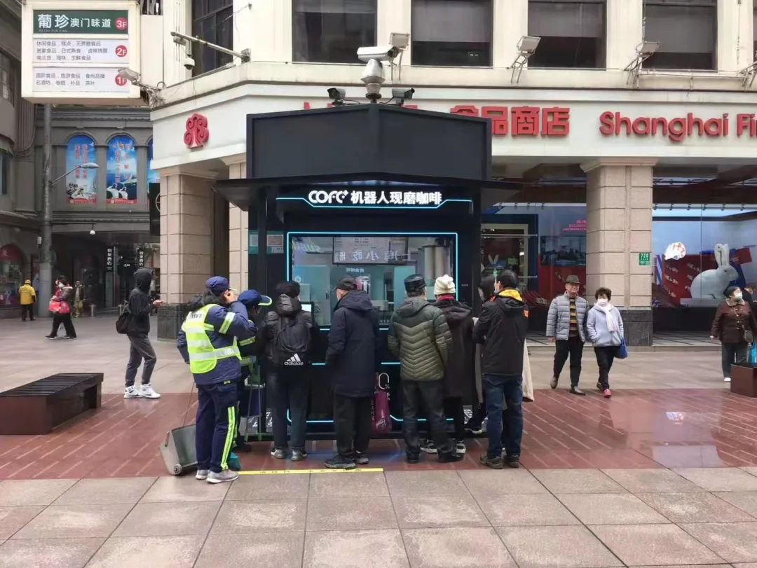 此外,在上海南京路步行街、中山公園地鐵口、世博園購物中心等地,還出現了“COFE+機器人現磨咖啡”,從遠處看像一個報亭,全程機器人操作,無人看守,24小時營業。