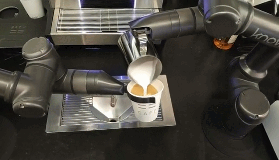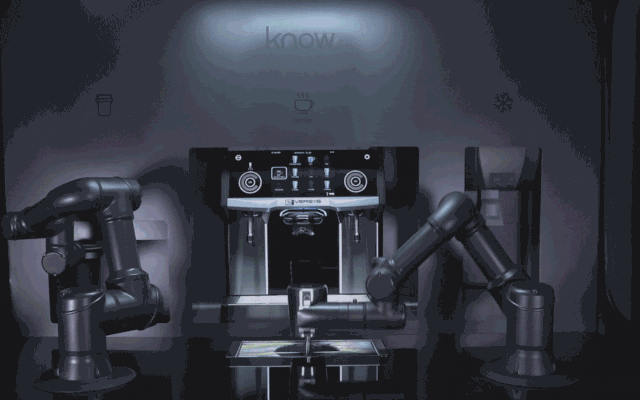 **出品過程都很有觀賞性:**機器人接到指令後,開始研磨咖啡豆,左機械手臂接取咖啡萃取液;右機械手臂接奶,對準左手臂的杯子拉花,完成後左手臂出品,右手臂清洗奶缸。