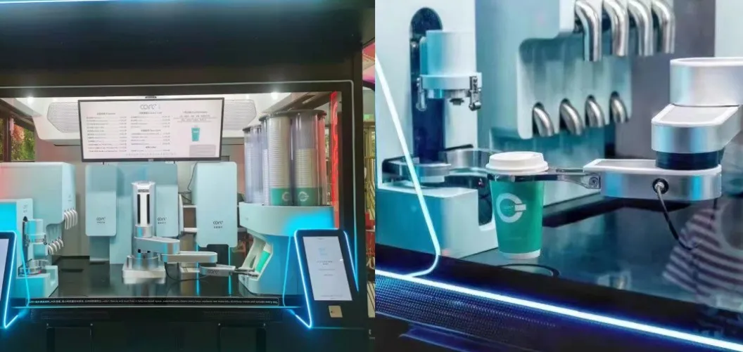 特別是COFE+,2.5㎡就能開店,24小時營業,全程無人操作,點單掃碼付款後,機器人平均50~60就能秒製作一杯咖啡,吸管和袋子自取。