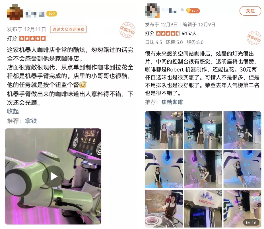 “炫酷”、“滿滿的高科技”、“咖啡師要失業了”、“做的咖啡不比真人差”,在小紅書、大眾點評、抖音,機器人咖啡的打卡筆記/視頻已經有幾萬篇。