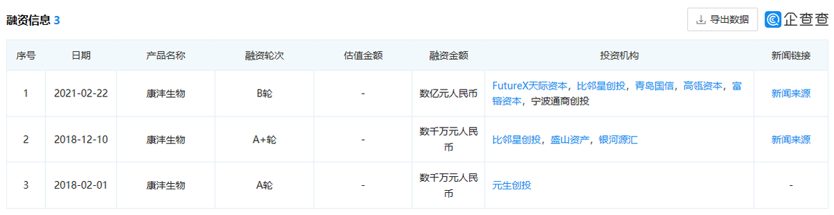 正是看中在市場上的影響力,康灃生物獲得了不少投資者的融資。據企查查數據顯示,康灃生物共獲得了10輪融資,投資陣容包括FutureX天際資本、比鄰星創投、青島國信、高瓴資本、富鎔資本、寧波通商創投、元生創投等投資機構。