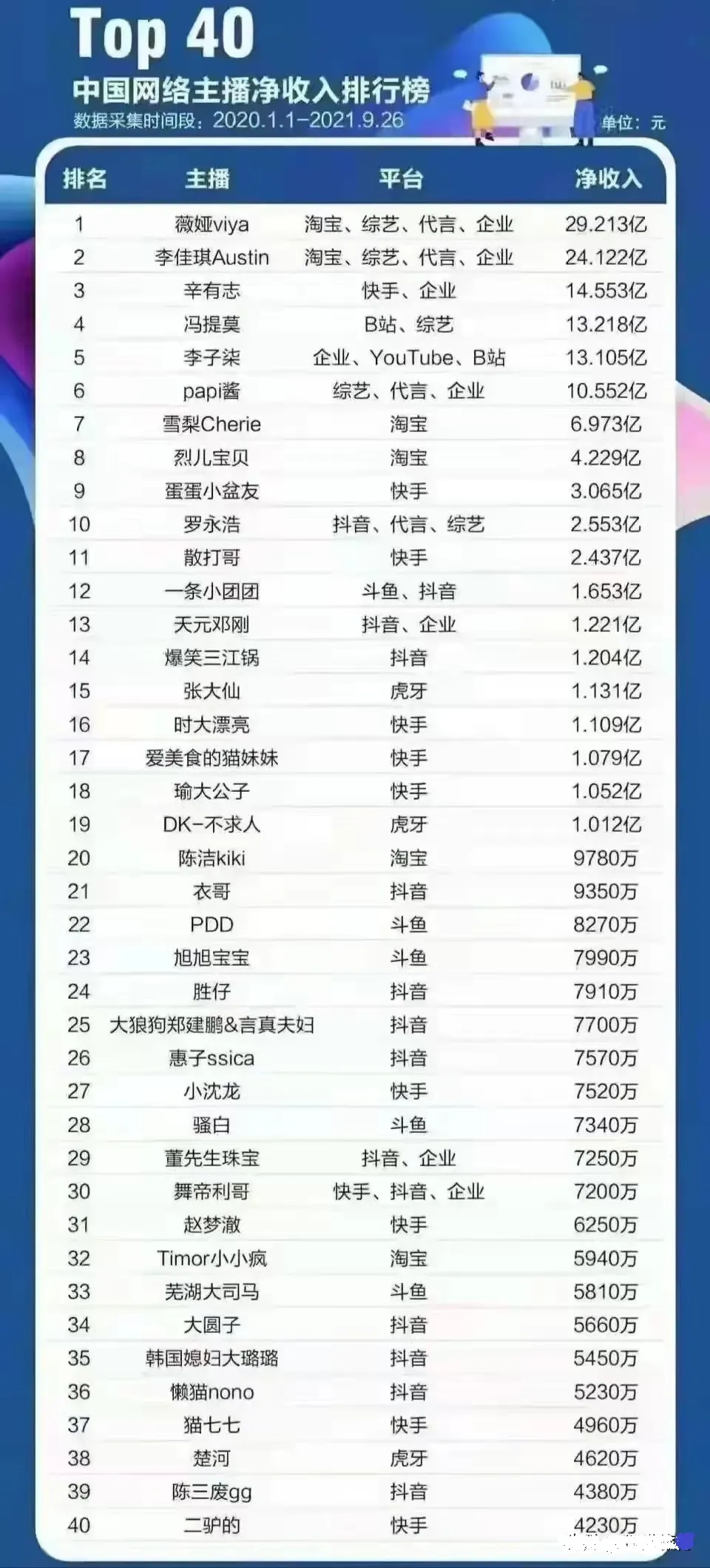 這兩天在網上看到一張收入榜,採集時間是2020年1月-2021年9月,可信度如何,不敢保證。不過從薇婭這次爆出的信息看,八九不離十。