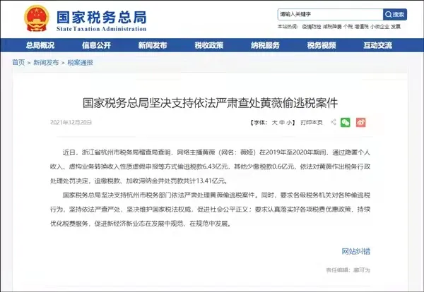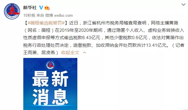 官方通報顯示:薇婭在2019年至2020年期間,通過隱匿其從直播平台取得的佣金收入虛假申報偷逃税款。