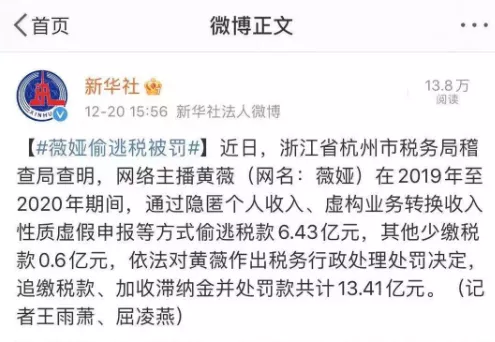昨天(12月20日),一條新聞引爆了熱搜:在2019年至2020年期間,薇婭偷逃税款6.43億,其他少繳税款0.6億,被追繳並處罰款13.41億元!