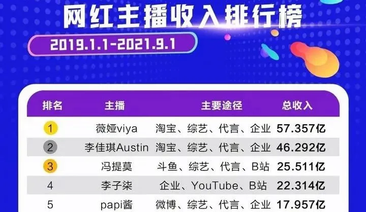在網上流傳着的一張“網紅主播收入排行榜”裏,薇婭、李佳琦分別以57.357億、46.292億元佔據榜首,甩開第三名馮提莫很大的差距。