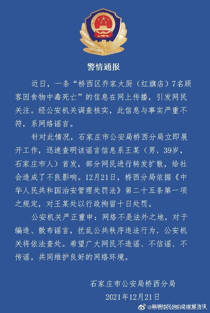 12月21日晚,石家莊市公安局橋西分局發佈一則警情通報回應上述“謠言事件”稱,近日,一條“橋西區喬家大廚(紅旗店)7名顧客因食物中毒死亡”的信息在網上傳播,引發網民關注。經公安機關調查核實,此信息與事實嚴重不符,系網絡謠言。