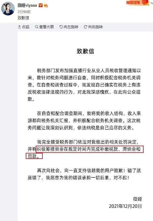 針對偷逃税款事件,目前薇婭也發了一封道歉信,表示對此深感愧疚,並向公眾道歉,並完全接受税務部門對其做出的相關處罰決定,並將積極籌措資金在規定時間內完成補繳税款、滯納金和罰款。