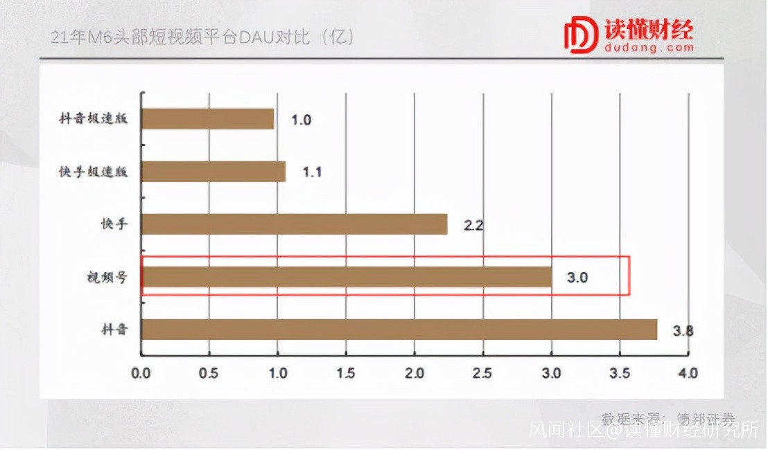 當抖快兩分天下後,視頻號又來攪局。從用户規模看,視頻號已經坐二望一。根據德邦證券數據,截至今年上半年,視頻號已經有3億DAU,超過快手,僅次抖音。而最新數據顯示,視頻號DAU已經超過5億。此外,有不少機構預測,視頻號未來將超過抖音,成為用户規模最大的短視頻平台。
