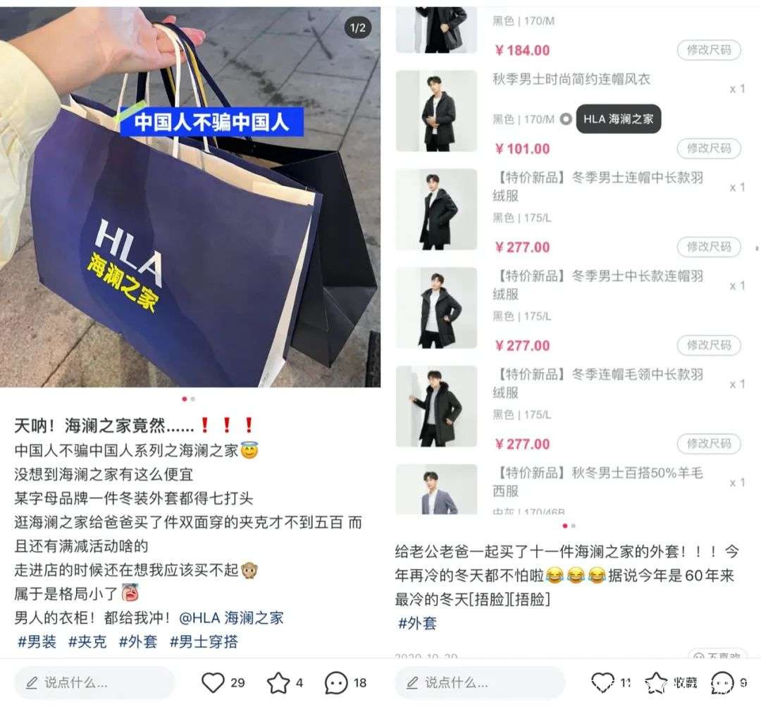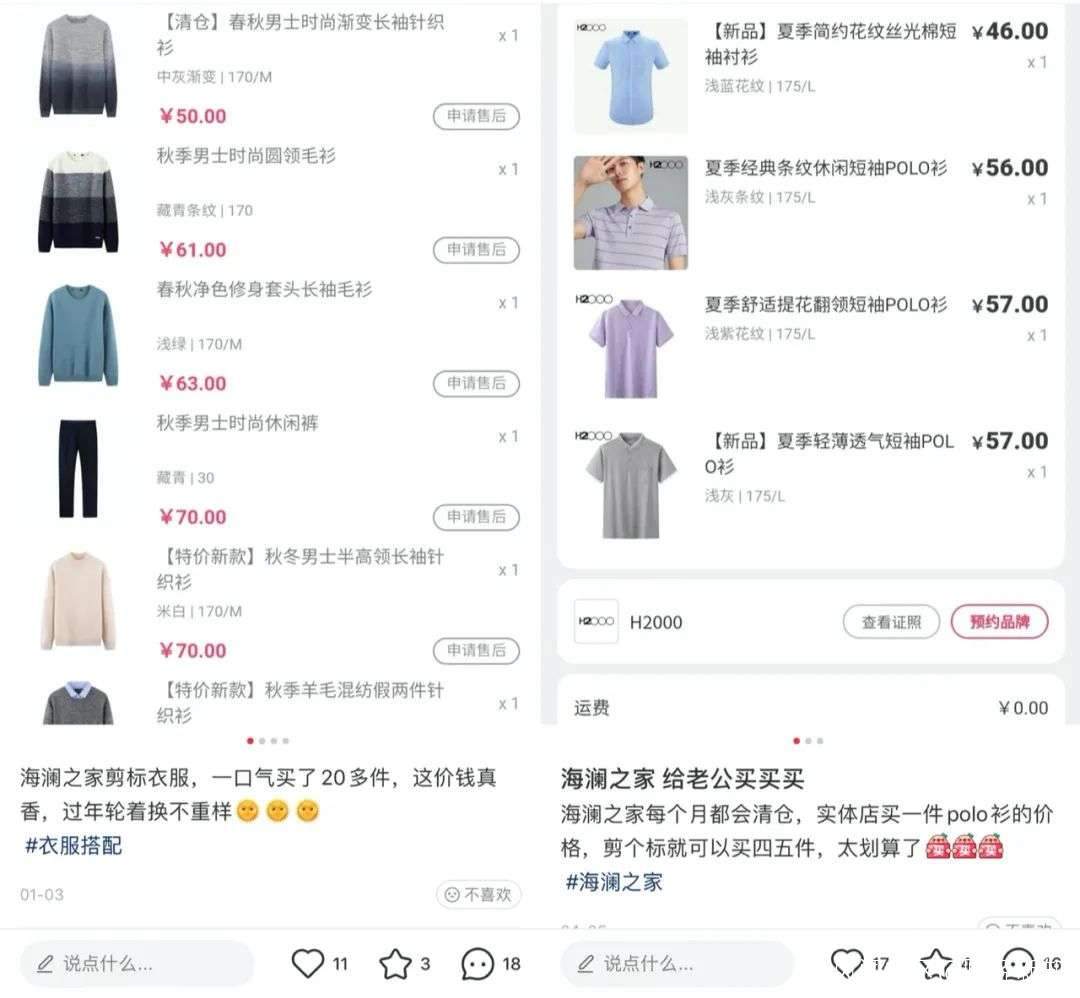在小紅書、微博等平台檢索海瀾之家相關的購物內容,多數都是女性發帖,表示為其丈夫或父親購買。這一定程度上反映了海瀾之家的處境,即在大眾認知中,海瀾之家依舊是面向成熟男性羣體的服裝品牌。