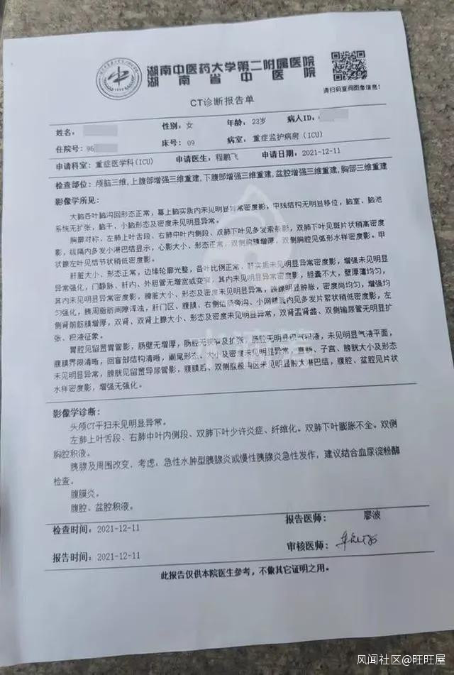 對於小輝在解放西路流浪時的遭遇,她的母親曠麗稱此前並不知曉。曠麗告訴記者,她和丈夫來自衡陽市衡山縣,兩人育有兩女,均患有不同程度的精神疾病。據曠麗回憶,小輝是從11歲開始發病的,起初她只以為是女兒到了青春期,有些叛逆,直到病情發展嚴重後,才確診為精神分裂症,多年來曾先後在廣州、長沙、杭州等多個城市就診。2018年5月,經衡山縣殘聯鑑定,小輝被鑑定為為精神殘疾二級。曠麗告訴記者,小輝發病時難以管束,經常不回家,她和丈夫曾報警尋找,但找回不久後女兒又會再次離家。上一次見到女兒是今年8月,當時小輝被警方找到,送回了她老家衡山縣的精神病醫院住院治療。三個月後,小輝出院,再度離家。小輝説,在老家時她受不了父親的嘮叨,因此決定重返長沙。據曠麗介紹,丈夫已年近古稀,家中僅靠她在南方某養老機構做保潔維持生活,實在無力照顧女兒。12月9日,小輝出事了。那天的直播中,本就有糖尿病的小輝一口氣喝下5瓶酸奶,頓時發病,隨後被送往湖南中醫藥大學第二附屬醫院ICU。12月11日的醫院CT診斷報告顯示,小輝雙側肺腔積液,胰腺及周圍改變,考慮急性水腫型胰腺炎急性發作,建議結合血尿澱粉酶檢查。同時,報告還顯示其有腹膜炎、腹腔和盆腔積液。