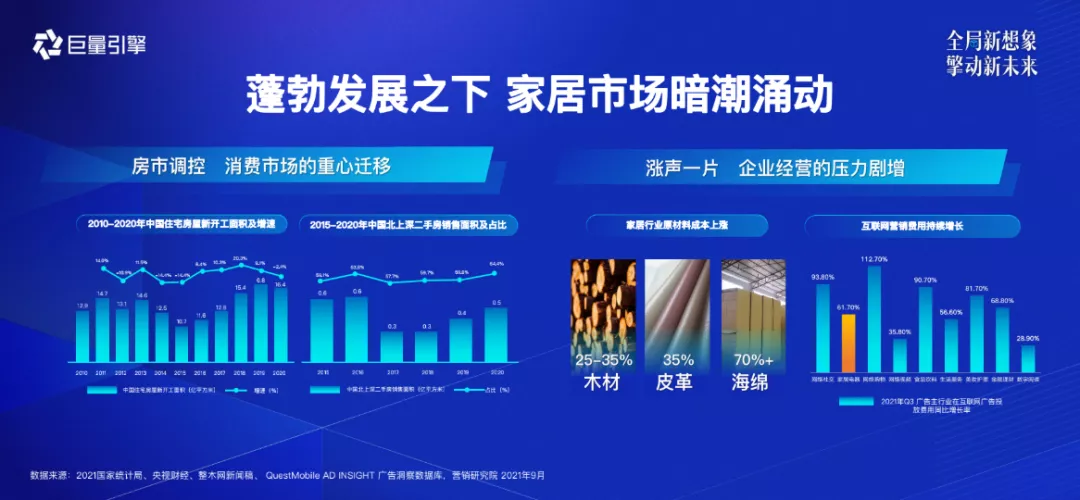 作為典型的地產後週期消費品類,此前家居行業的高速成長一直都受益於地產的高景氣;然而最近幾年,隨着“房住不炒”、“住有所居”等理念的日漸深入人心,以及“三道紅線”等調控政策的落地,曾經無比火熱的樓市被一再降温,致使家居行業增長動力不足。與此同時,由於各方面成本、營銷環境複雜度的不斷提升,由此帶來的生意重心、營銷預算、競爭手段等變化,進一步提升了家居品牌的增長難度。