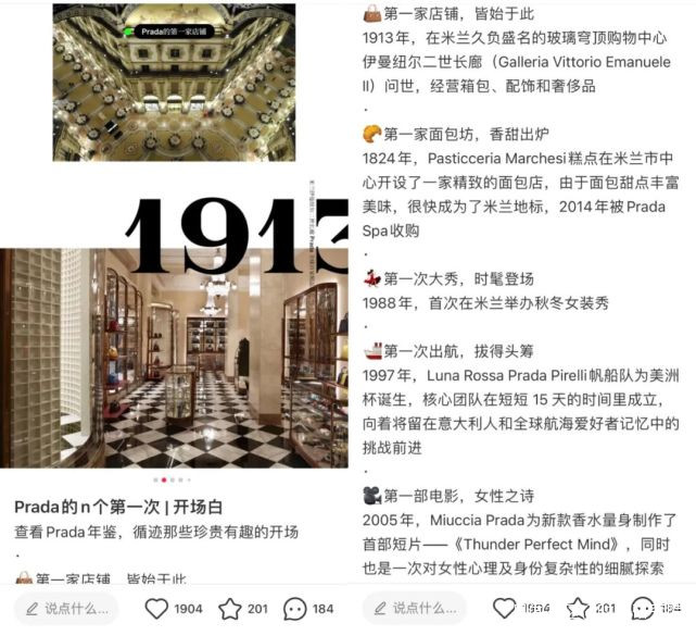 Prada此次入駐以開設小紅書賬號為開場白,第一篇筆記介紹了Prada年鑑,不同於大多數品牌在小紅書賬號同步其他平台內容的方式,Prada發佈的文案更像是一篇為小紅書量身定製的筆記。