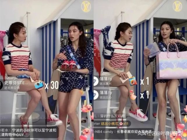在這次直播中,時尚博主程曉玥和LV品牌摯友鍾楚曦在直播間講解新品,但與大眾所見直播不同的是,沒有直接介紹單品價格,而是設置了專門的問答環節,來強調直播的互動性。