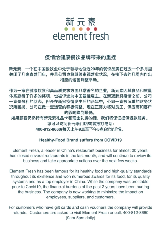 就在紅餐網發稿前,新元素餐廳通過其微信公眾號發表了《寫給新元素粉絲的信》,信中新元素重申了疫情對健康餐飲品牌帶來的重挫,在疫情發生的兩年中,公司從原本盈利的狀況變成被沉重的財務狀況所困擾。公司也一直有做一些運營的積極調整,表示在過去一個月關閉了幾家直營店,未來將繼續審視營業狀況,接下來幾周內作出相應的運營調整舉動,努力對員工、供應商和客户的影響降到最低。