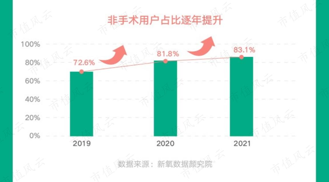 據《2021醫美行業白皮書》顯示,2019年-2021年非手術醫美用户佔比持續提升,從72.6%提升至83.1%。在區域發展上,未來,二線城市有望成為醫美市場新的增長極。2019-2021年,二線城市消費人羣數量近三年來持續增長,至2021年,這一羣體比例已經達到18.33%,與一線、新一線城市呈現三足鼎立之勢。