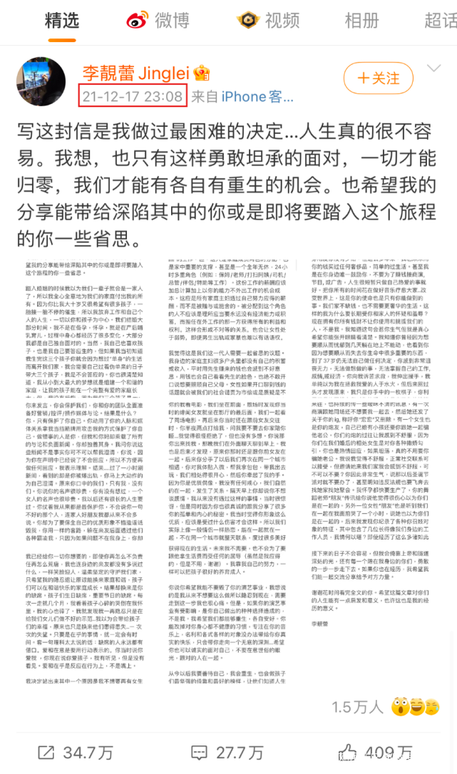12月18日,凌晨1點22分,僅僅距離李靚蕾的微博過去了2個小時多一點。