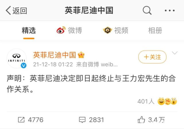 英菲尼迪以神速宣佈了一條信息:“英菲尼迪決定即日起終止與王力宏先生的合作關係。”