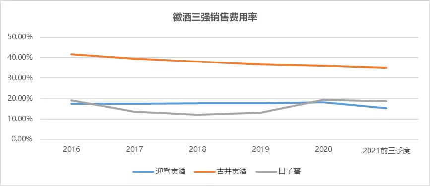 對於徽酒這樣注重營銷的區域市場,營銷費用多寡更能反應企業經營狀況。對比三者期間銷售費用率,迎駕貢酒前三季度的15.18%是三者中最低的。