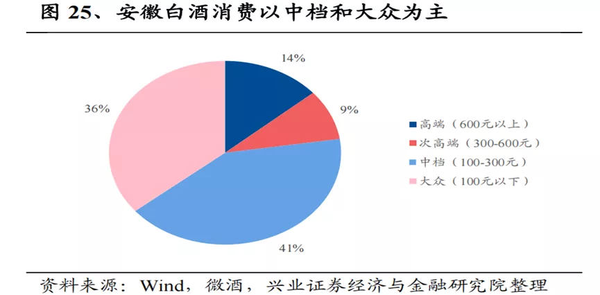 興業證券研究顯示,當前徽酒市場其中100-300元中檔酒份額達41%,為徽酒強勢價格帶。次高端及以上佔比僅為23%。未來升級空間可以想象。