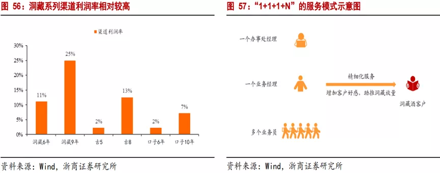除了深度分銷模式,豐厚的渠道利潤對經銷商激勵作用也很強。據浙商證券研究顯示,洞藏9年渠道利潤率達25%,顯著高於古5古8,口子10等同級別競品利潤率。