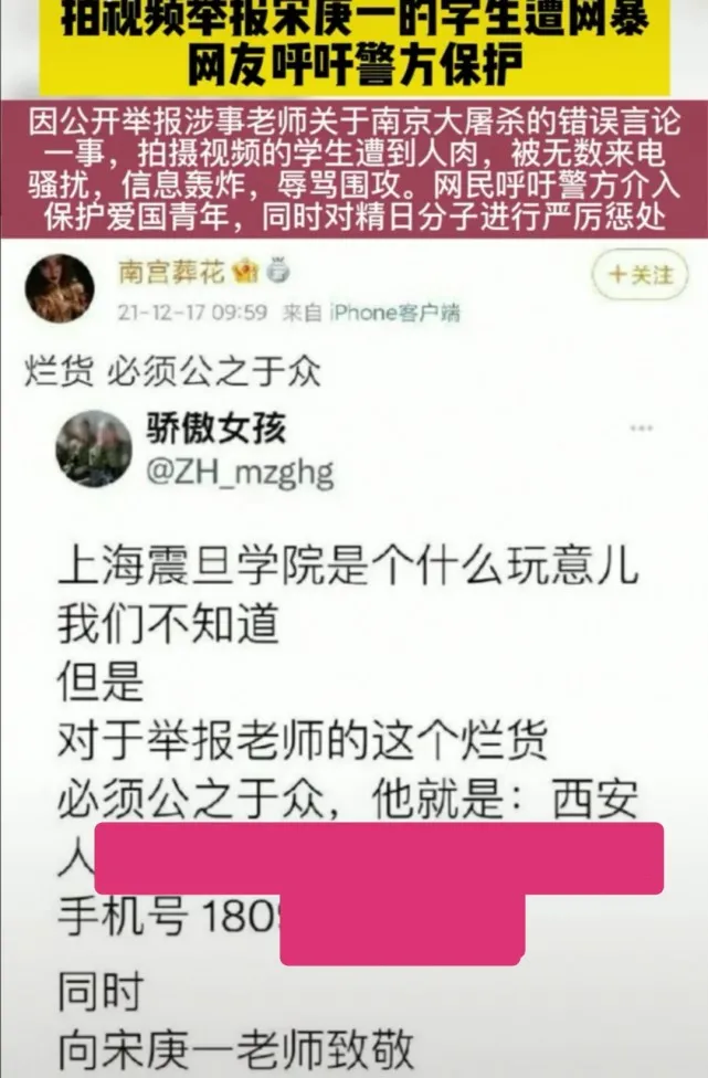 實際上,宋庚一事件中,並不存在這樣的邏輯。因為宋庚一在國家公祭日在課堂上否定南京大屠殺,搞歷史虛無主義,給日本右翼扭曲歷史以口實,這就不是一個私密行為,而是公開的“輿論灌輸”、“新聞傳播”,她的學生課堂上敢怒不敢言,於是把視頻拍下來,傳播到網上……這叫“告密”嗎?這是把無德無才教師的嘴臉公之於眾。這不是個人恩怨,這是公心公義。