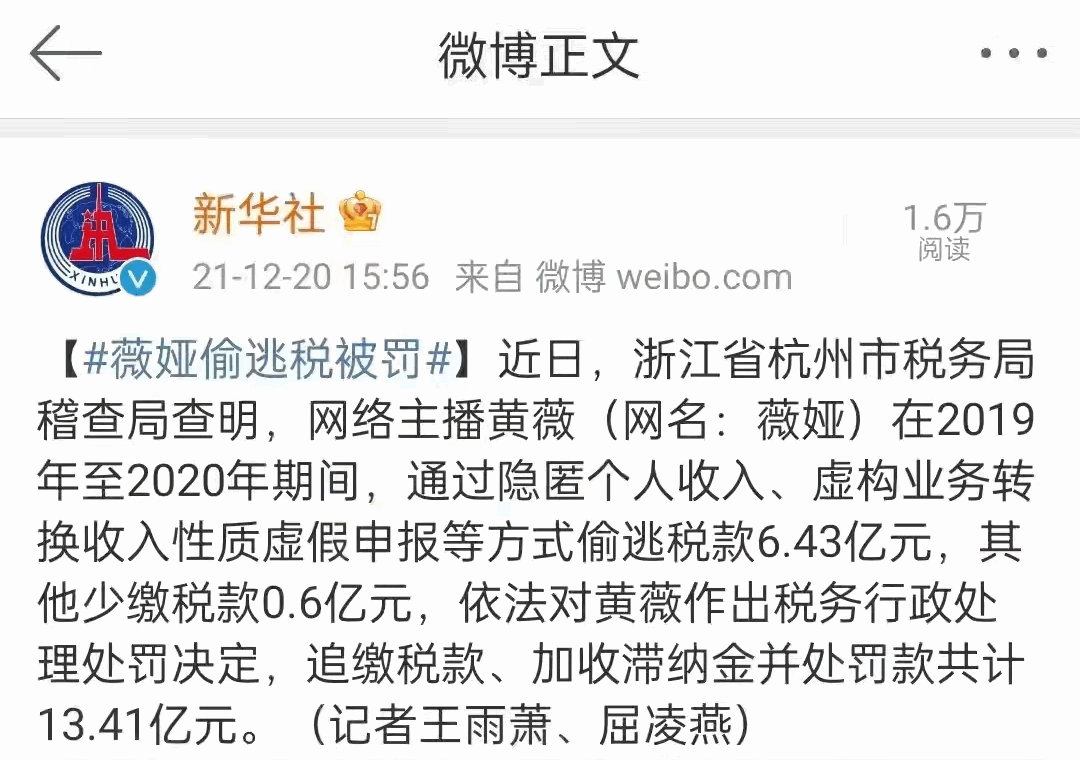 昨天央視網發佈消息,浙江省杭州市税務部門經税收大數據分析發現網絡主播薇婭(黃薇)涉嫌偷逃税款6.43億元,少繳税款0.6億元。杭州税務局根據法規規定,對薇婭追繳税款、加收滯納金並處罰款,共計13.41億元。