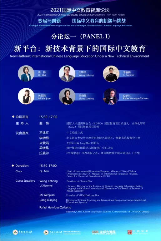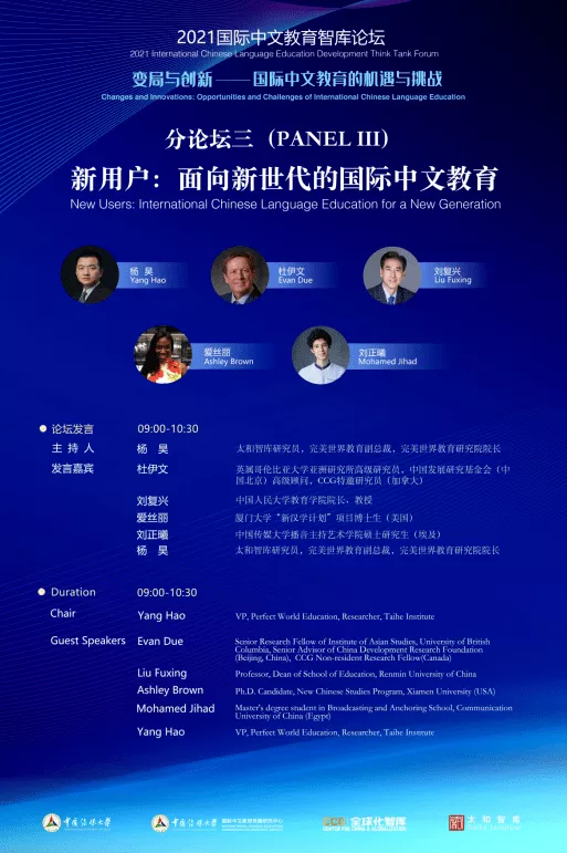 2021國際中文教育智庫論壇以“變局與創新——國際中文教育的機遇與挑戰”為主題,分設“新平台·新技術背景下的國際中文教育”,“新環境·新全球格局下的國際中文教育”和“新用户·面向新世代的國際中文教育”三個分論壇,旨在開啓智庫交流合作的長效機制,共同推動語言的推廣和文明的互鑑。