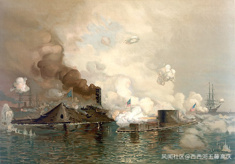 説起來很對不起觀眾的期待,雙方互相以幾分鐘一炮的速度慢悠悠打了幾個小時,實心大鐵球炮彈飛來飛去,卻都無法造成致命傷。二者也曾試圖玩碰碰船,但他們都是慢悠悠的鐵烏龜,航速只有5節左右,所以仍然沒能分出勝負,最後打個平手回營休戰。下圖畫的就是這兩艘鋼鐵怪物在交火,左邊長得象墳包的是弗吉尼亞號,右邊長的象潛艇的是Monitor號,就算比外貌二者也是棋逢對手,Monitor號低到極點的船舷預示了未來的命運。
