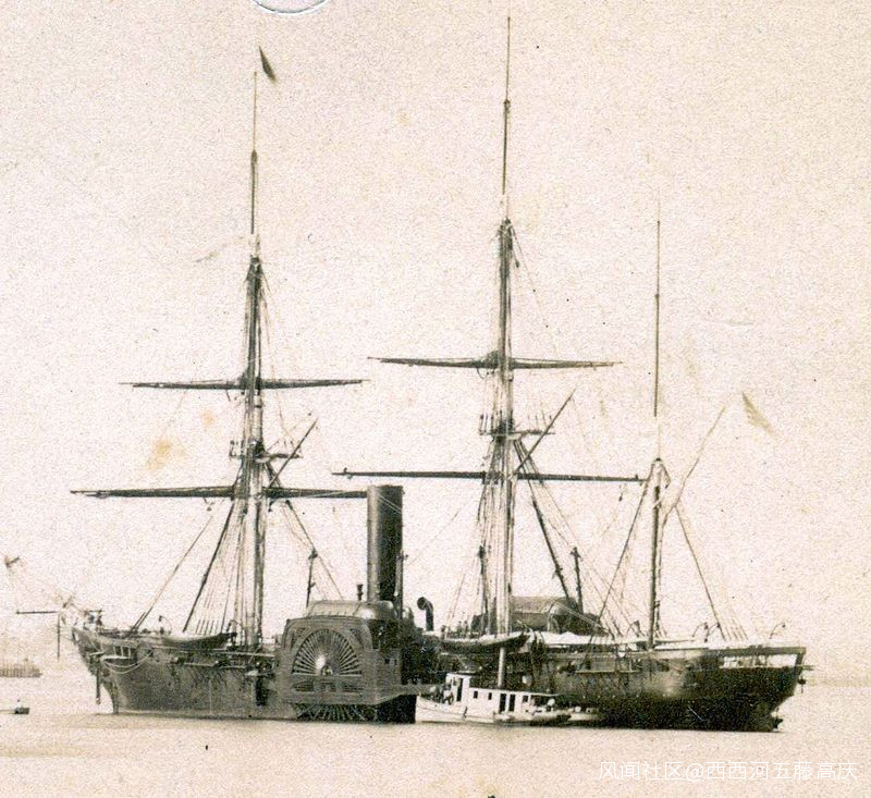 第二艘是1857年服役的Niagara號護衞艦(下圖),該船是美國海軍最先採用螺旋槳的六艘護衞艦之一,不見明輪,仍有桅杆和船帆,只有冒出黑煙的煙囱才能表明這是一艘蒸汽船。該船雖然仍是木製,噸位已經猛增到5500噸,新中國海軍直到20年前才擁有了這個噸位的主力艦。Niagara號第一個任務就是架設英美海底電報電纜(嚴格的説是從愛爾蘭到加拿大紐芬蘭),這條電纜是世界上第一條跨洋電纜,1858年開通,英國維多利亞女王和美國總統布坎南用這條電纜互致賀電,可惜因為材料不過關只維持了3個月就失效了,直到1866年兩國間的海底電纜線才開始穩定運行。Niagara號之後的一個重要任務是護送日本的萬延遣美使節團回國,這個使團是1860年初乘船來到美國的,為日本開國後派出的第一個使團,之中有日本啓蒙思想家福澤諭吉、日本近代海軍的創建者勝海舟。1860年夏天他們在紐約搭乘Niagara號返回日本。