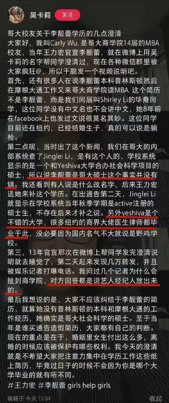 自己放料令謠言四起,讓大家誤以為李靚蕾是在他的幫助下才能去哥大讀書。