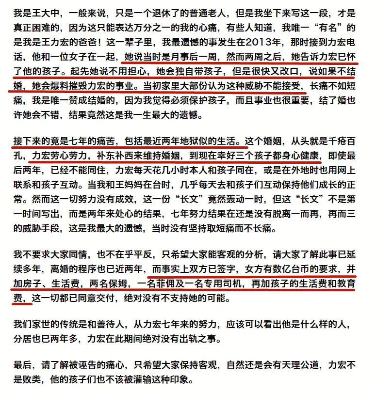 王爸爸,一位八十多歲的老人,為了維護45歲男寶的名譽,為了揭露5年生三孩的蛇蠍毒婦李靚蕾,手寫了一封澄清信。