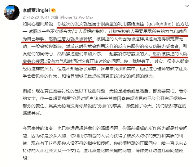 李靚蕾再次放錘,除了提到王力宏顛倒黑白外,還有一個很重要的詞“煤氣燈效應”。