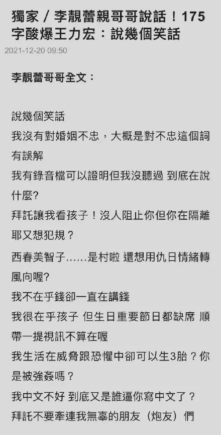 坐實了李靚蕾説王力宏永遠只會躲在親人背後,借別人的手達到自己的目的。