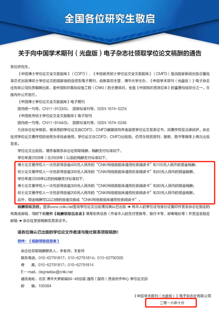 幾年前,知網曾發佈聲明,給碩博士論文上傳者補發稿費。近幾年,知網改為每年給高校碩博士畢業生髮放知網消費卡。每一個當年畢業的碩士博士,在完成最終答辯後,都可以通過學校,領取一定面值的知網消費卡。