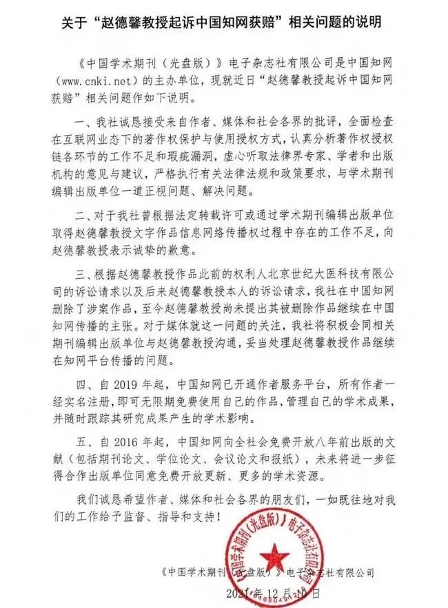 起因是89歲的中南財經政法大學退休教授趙德馨對知網的“控訴”。自2013年起,趙德馨以自身作品信息網絡傳播權受到侵害為由數次起訴知網,全部勝訴後累計獲得超70萬元賠款。12月10日,知網發佈《關於“趙德馨教授起訴中國知網獲賠”相關問題的説明》,相關話題登上熱搜,獲得3.8億閲讀量。