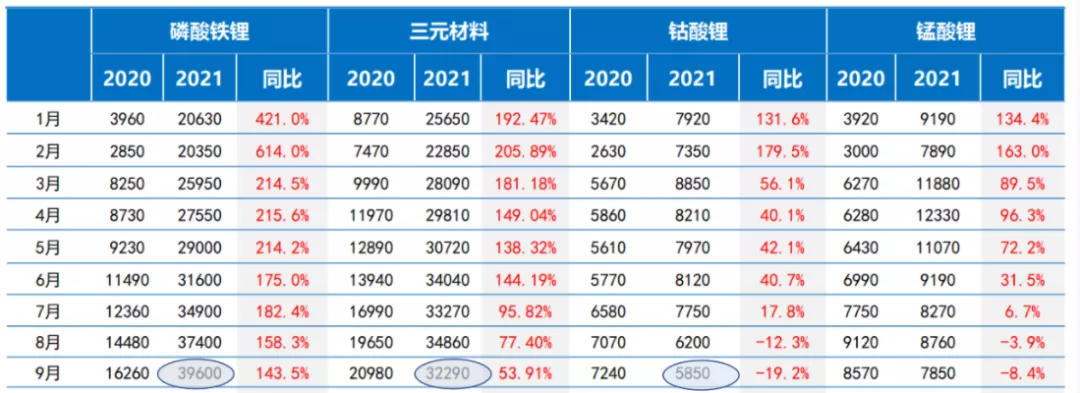 圖4:2021年主要正極材料產量情況。資料來源:鑫羅資訊
