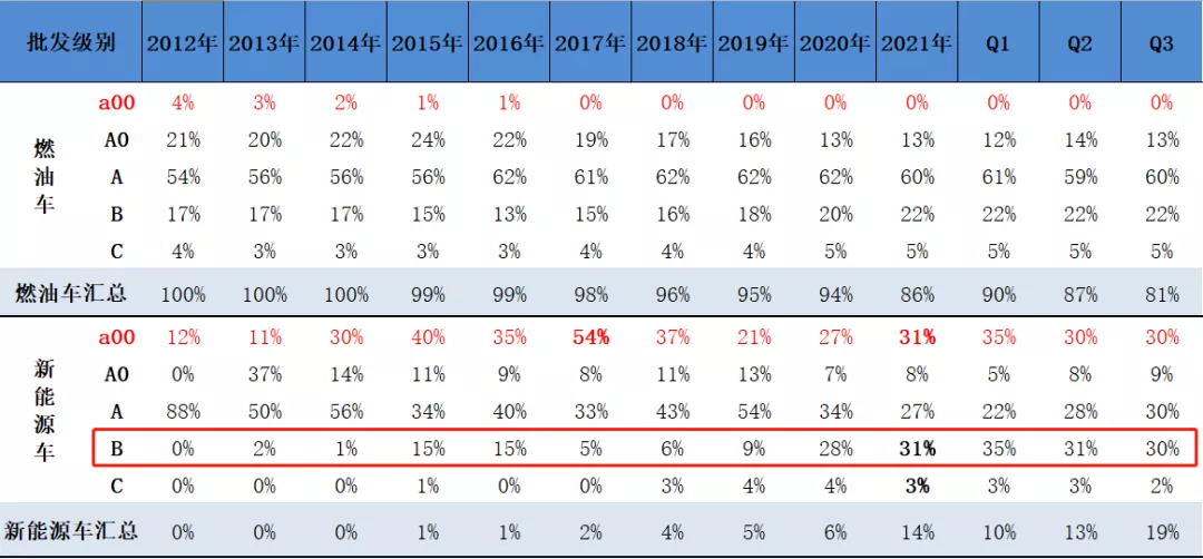 參照燃油車市場,A、B級車是主流,A00級別車型基本沒有市場。而在新能源市場,低續航的A00級別車型佔比最高,但是其市佔率正逐漸萎縮;反觀高續航B級電動車的滲透率正快速提升。