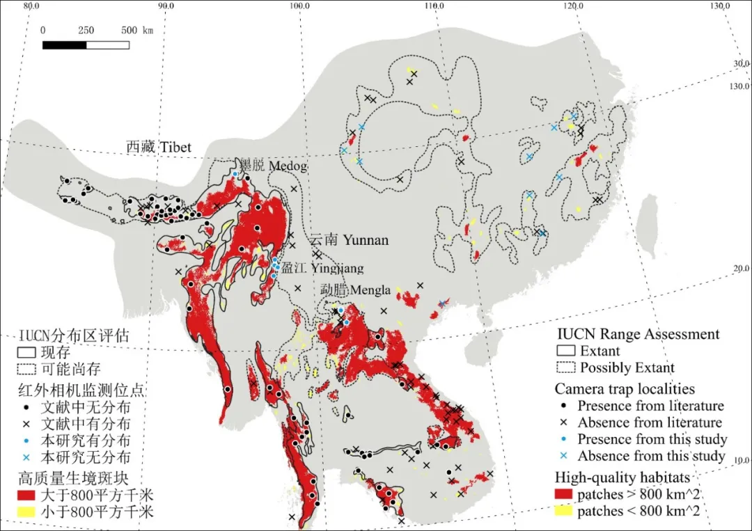 不過在明顯的分佈縮小之外,其實大家仔細看,現存黃色區域的斑塊邊界依然非常粗略、平滑,這説明即使是今天人們對雲豹的瞭解都是非常有限的。