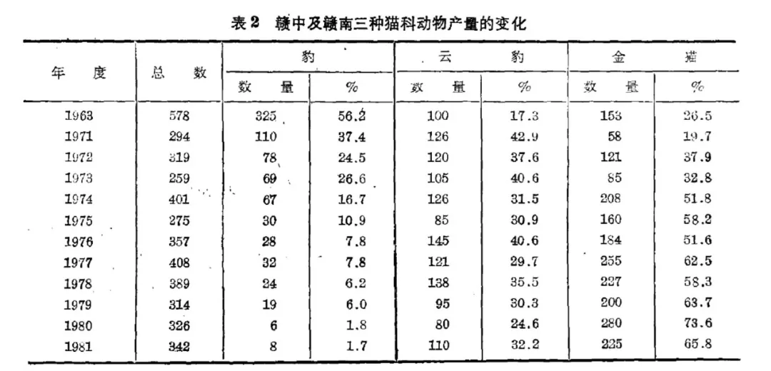 這是江西省的紀錄,學者盛和林的統計指出,1963年到1981年將近20年間,雲豹的每年產量都幾乎是一百上下,當地老百姓會打這麼多雲豹把皮交給政府,由政府賣掉。