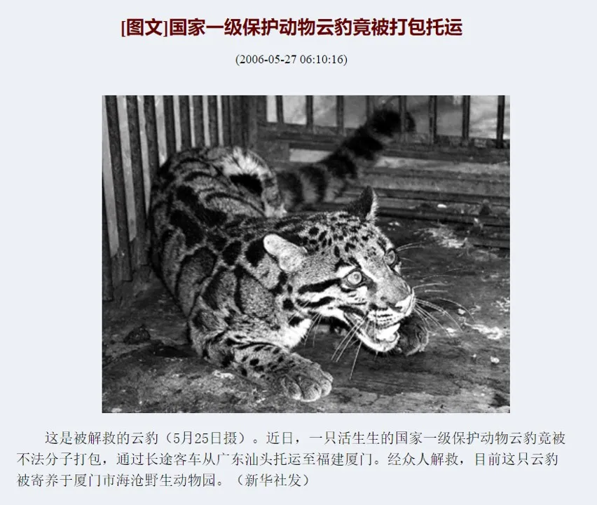 2006年,有人在汕頭偷運一隻雲豹去廈門
