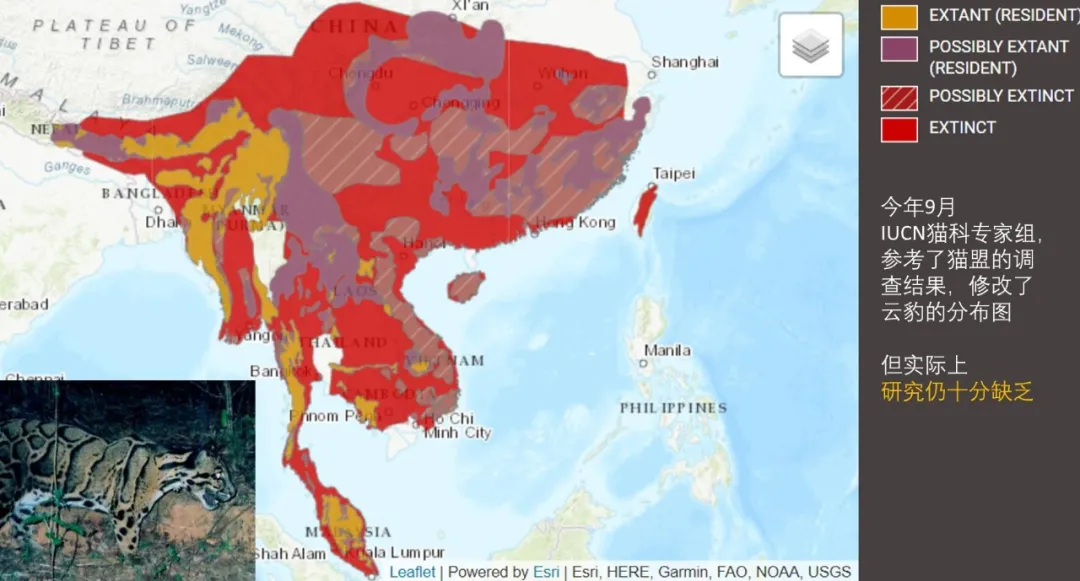 IUCN雲豹專家組今年9月份剛剛出了一張新的分佈圖,黃色部分是目前確定有雲豹的地區,很明顯雲豹已經比它的歷史分佈區少了太多太多。