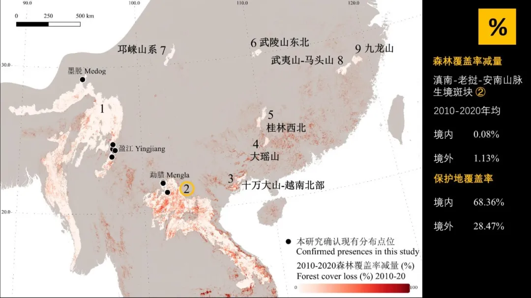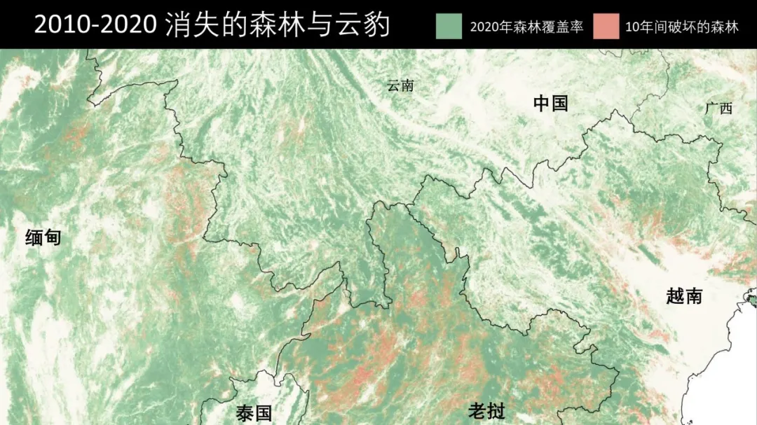 以目前現存最大雲豹分佈區域之一滇南-老撾-安南山脈生境斑塊為例,2010~2020年間,這個地區境內的森林覆蓋率減量為0.08%,而境外則達到1.13%。