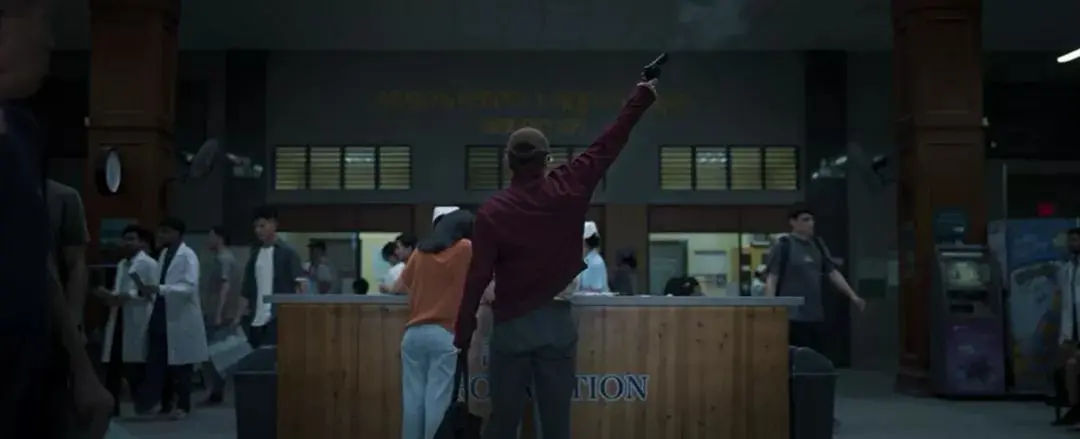 剎那間,大廳里人羣驚叫四散,留下幾位不幸的人質毛骨茸然。