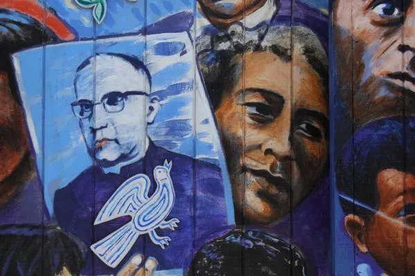 羣眾高舉解放神學的殉道者,奧斯卡·羅梅羅的畫像