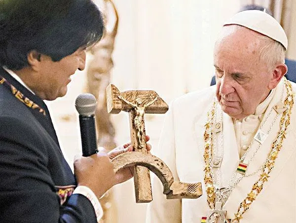 2015年,方濟各訪問玻利維亞期間,被該國左翼總統莫拉萊斯贈予“鐮刀錘子”十字架。