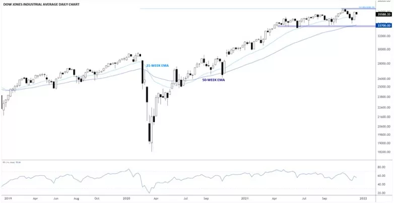 後市需要關注的關鍵價位在33700附近,那是2021年後三個季度的前支撐位與上翹的50周指數移動均線相匯處。如果在2022年年初下破該位,可能引起多頭警惕。而若站上36600,可能確認上升趨勢,多頭因此可能上看40000。