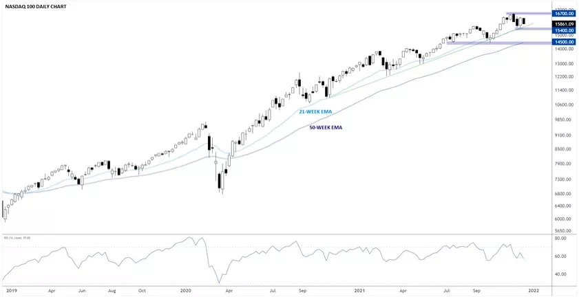 相比之下,科技股密集的股指納斯達克100指數短期壓力或更大。該指數圖表的形態和標普500指數相似:價格在牢固的上漲通道內走高,過去18個月交易者不斷在其下探21周指數移動均線後逢低買入。納斯達克100指數在年初需要重點關注的價位是15400附近(過去一週收於15801.46),如果下破,可能下看14500。