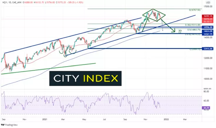 這個科技股密集的股指於11月22日創下歷史高點,一路向下,近期反擊歷史高點失敗後,回撤至50天均線所在的15800附近,接着回升並試圖創下歷史新高,但不敵空頭。空頭在16413附近發起攻擊,帶動股指下跌的途中引發多個止損。