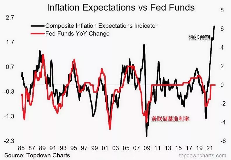 事實上,也有機構人士調侃道,只要看一下上圖歷史上通脹預期和美國聯邦基金利率的圖形就不難發現,被稱為鷹派的美聯儲實際上最多是一隻“乳鴿”,加息進度仍遠落後於通脹預期。